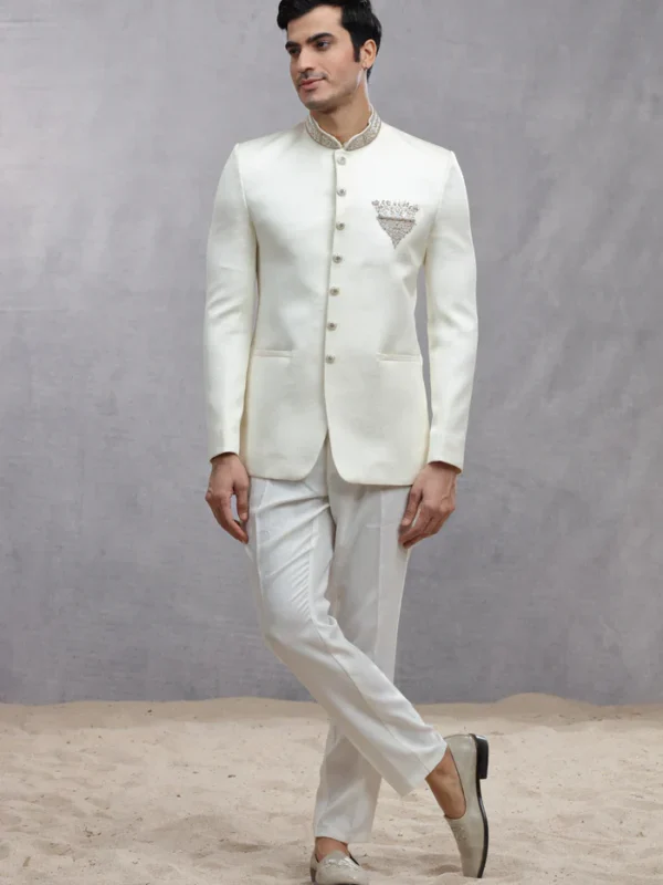 Perfect for weddings, receptions, and formal occasions, these suits combine the traditional Nehru collar style with contemporary detailing.