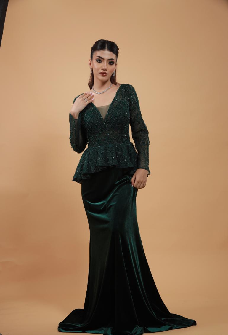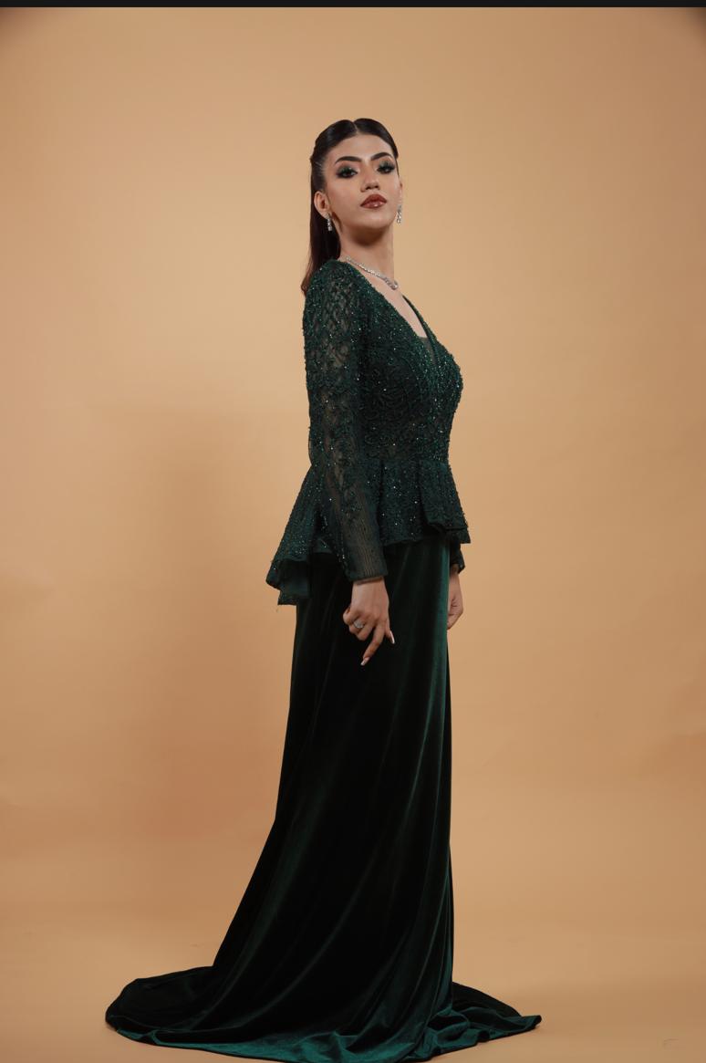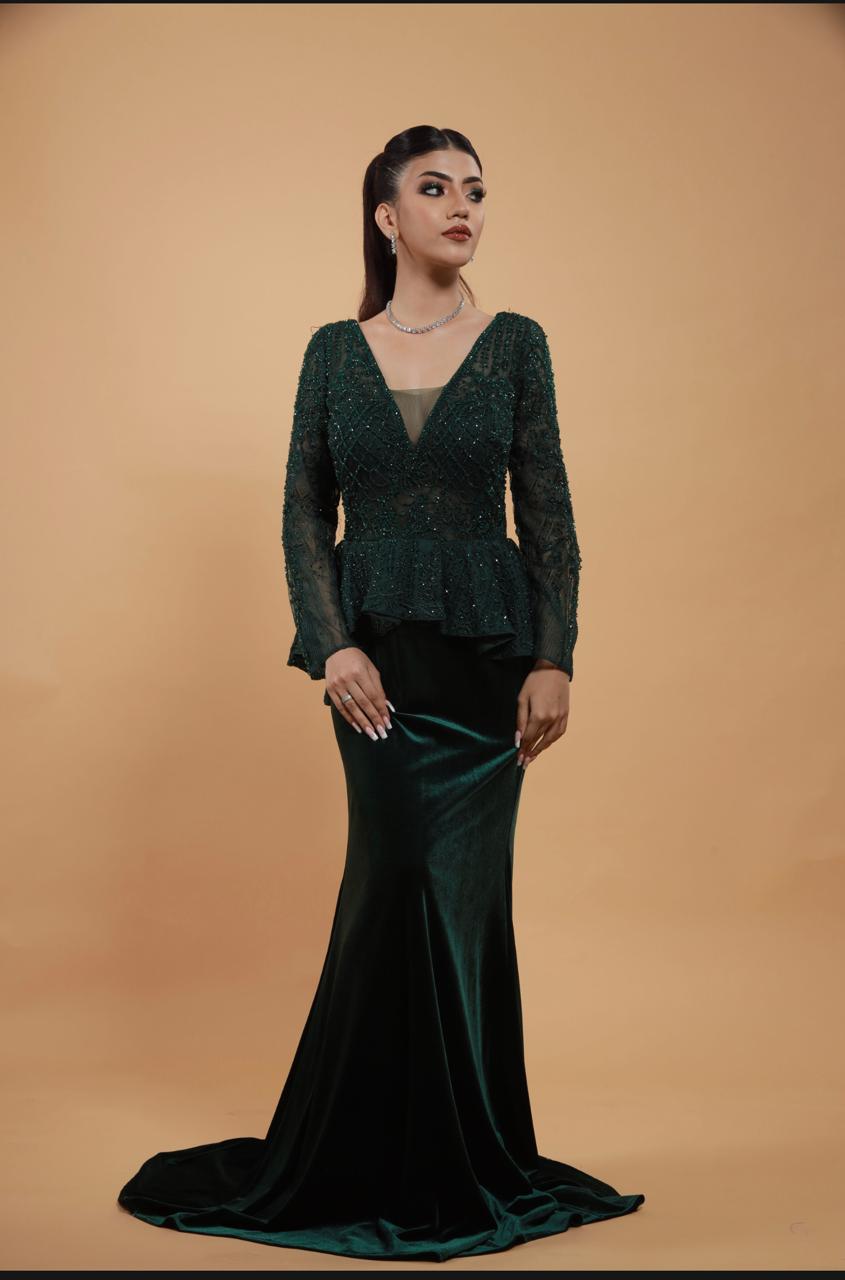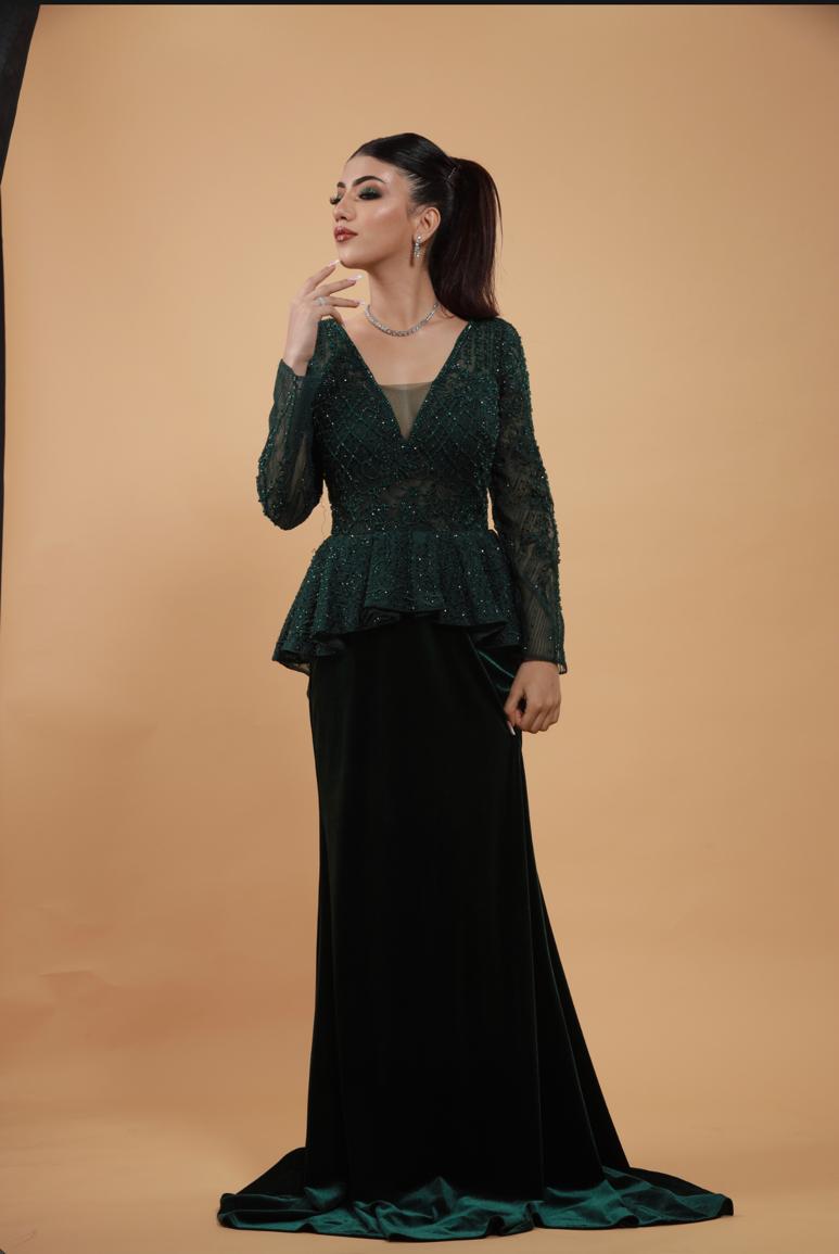 A captivating emerald green gown crafted with a velvet base and a delicately beaded net bodice. The peplum-style waist and long sleeves bring elegance and structure, while the flowing mermaid silhouette adds a refined charm. Perfect for formal dinners, receptions, and luxury evening wear collections.