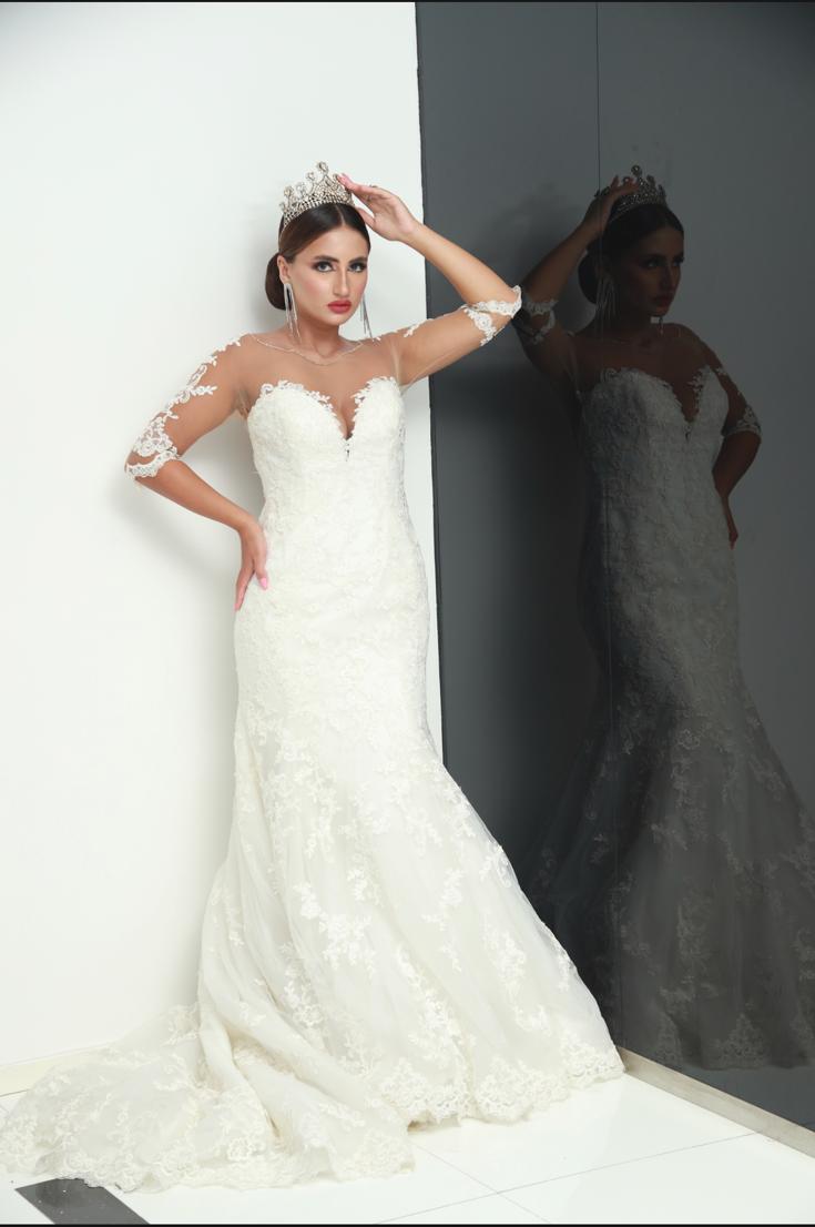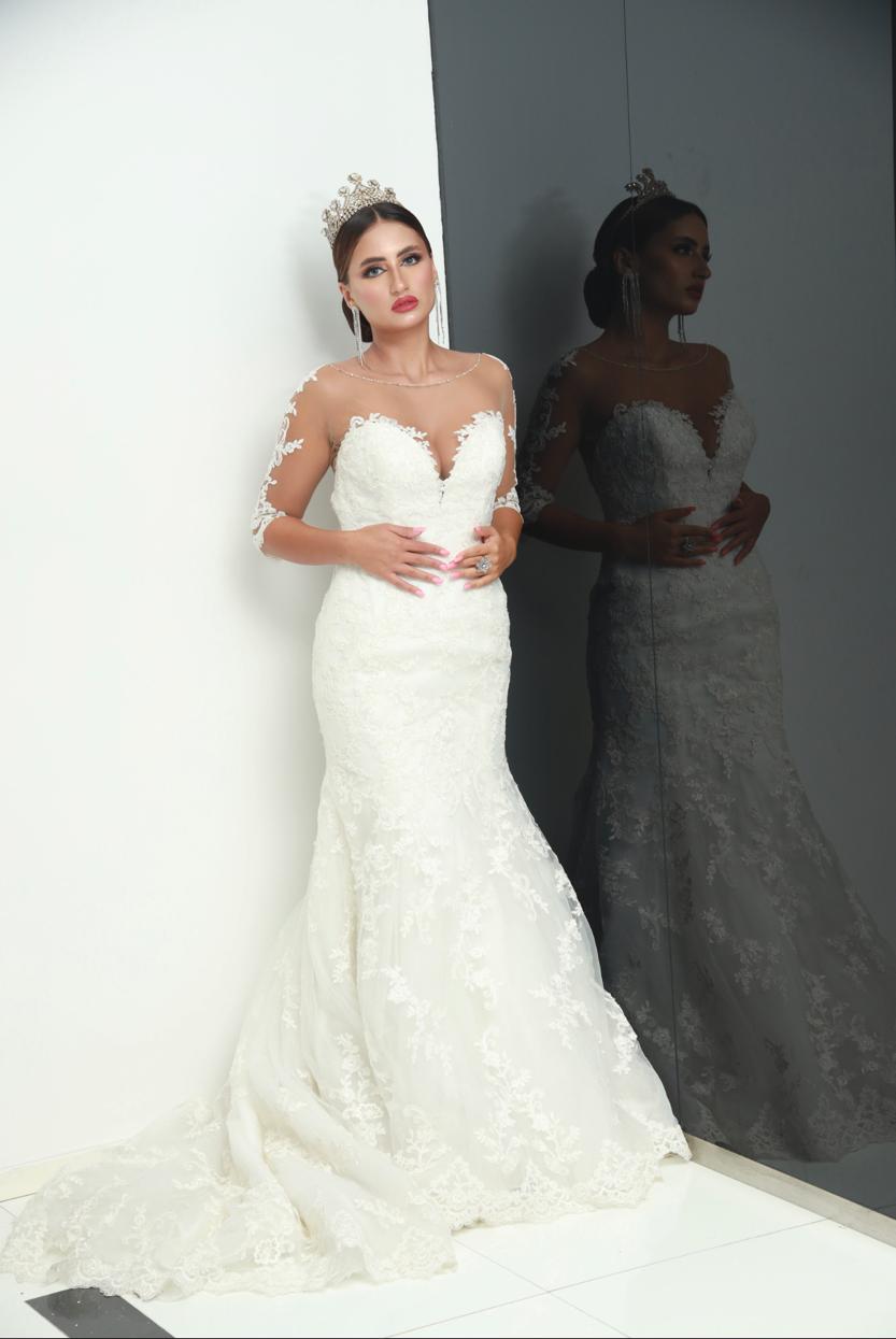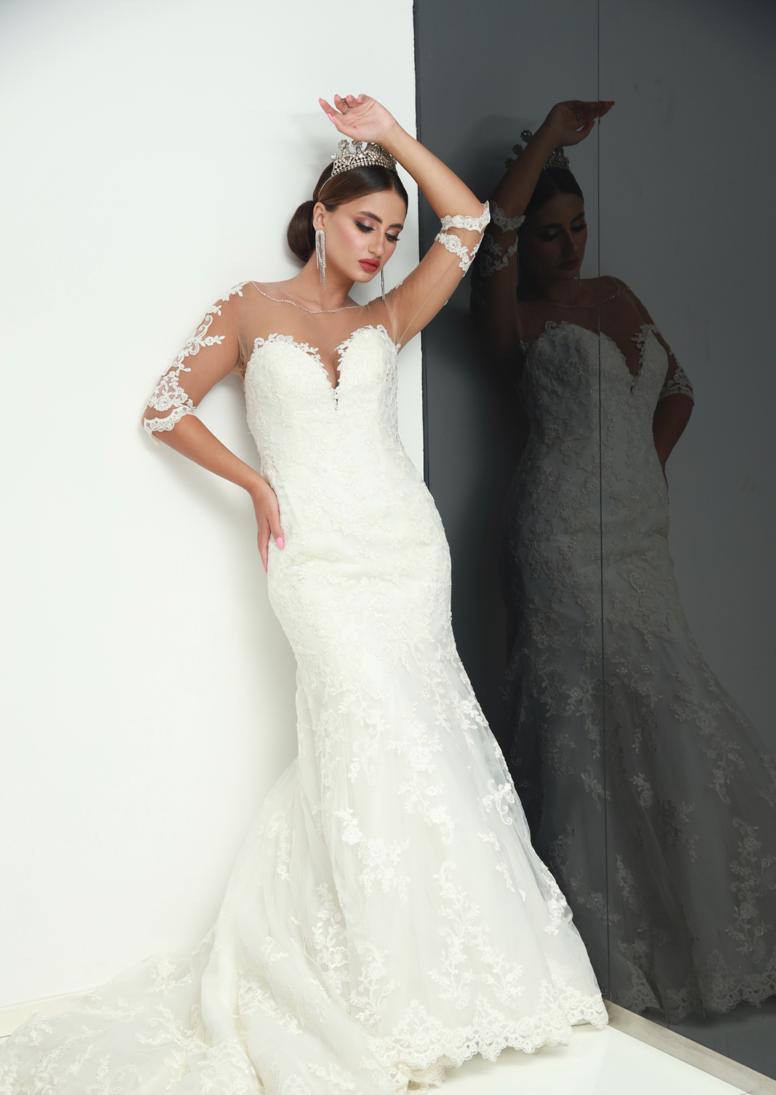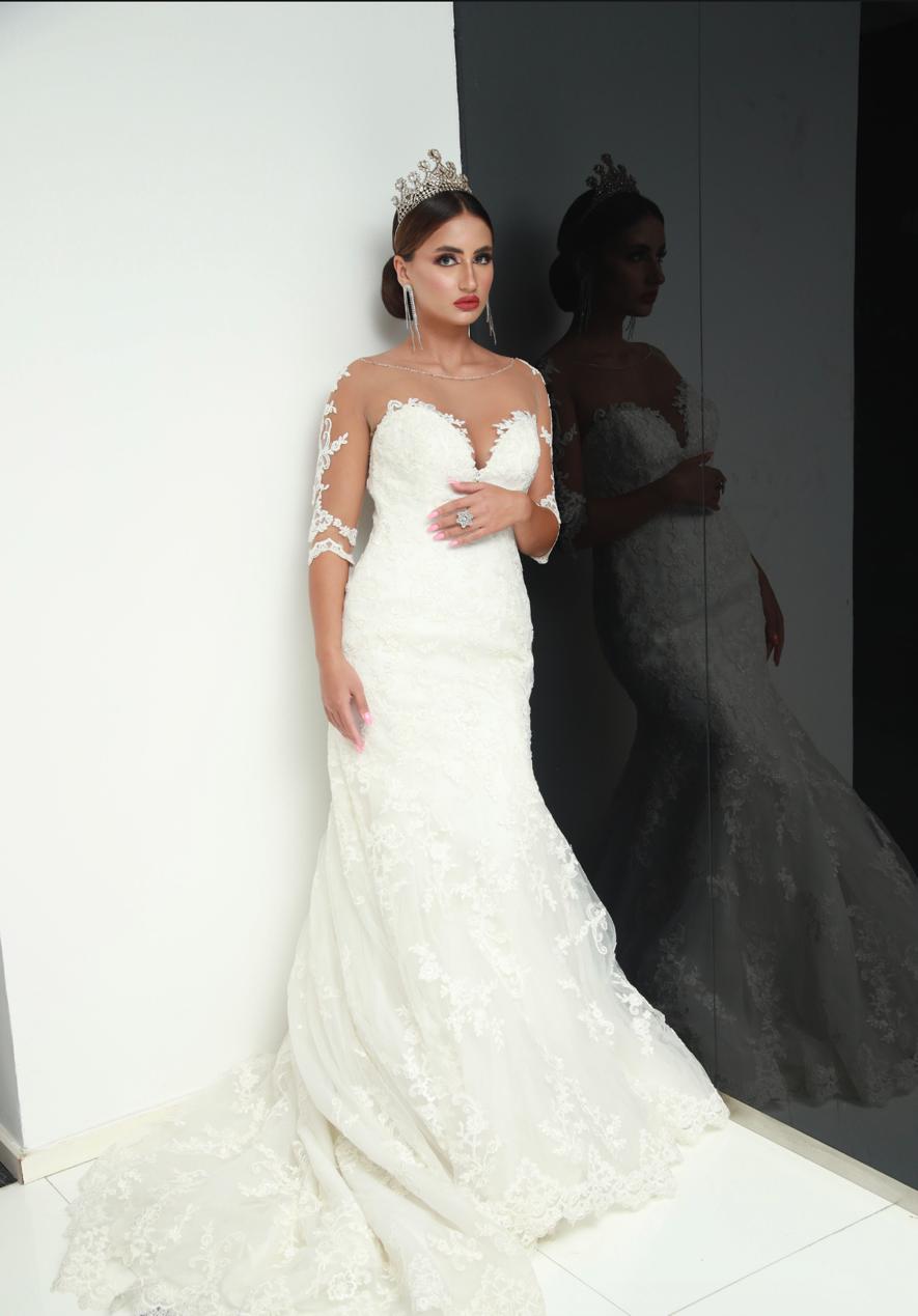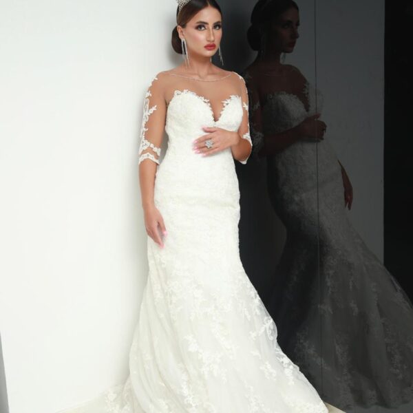 A breathtaking ivory wedding gown designed with intricate lace embroidery and an illusion neckline. The fitted silhouette flows into a graceful train, complemented by sheer lace sleeves for a romantic finish. Perfect for modern brides seeking timeless elegance and regal charm.