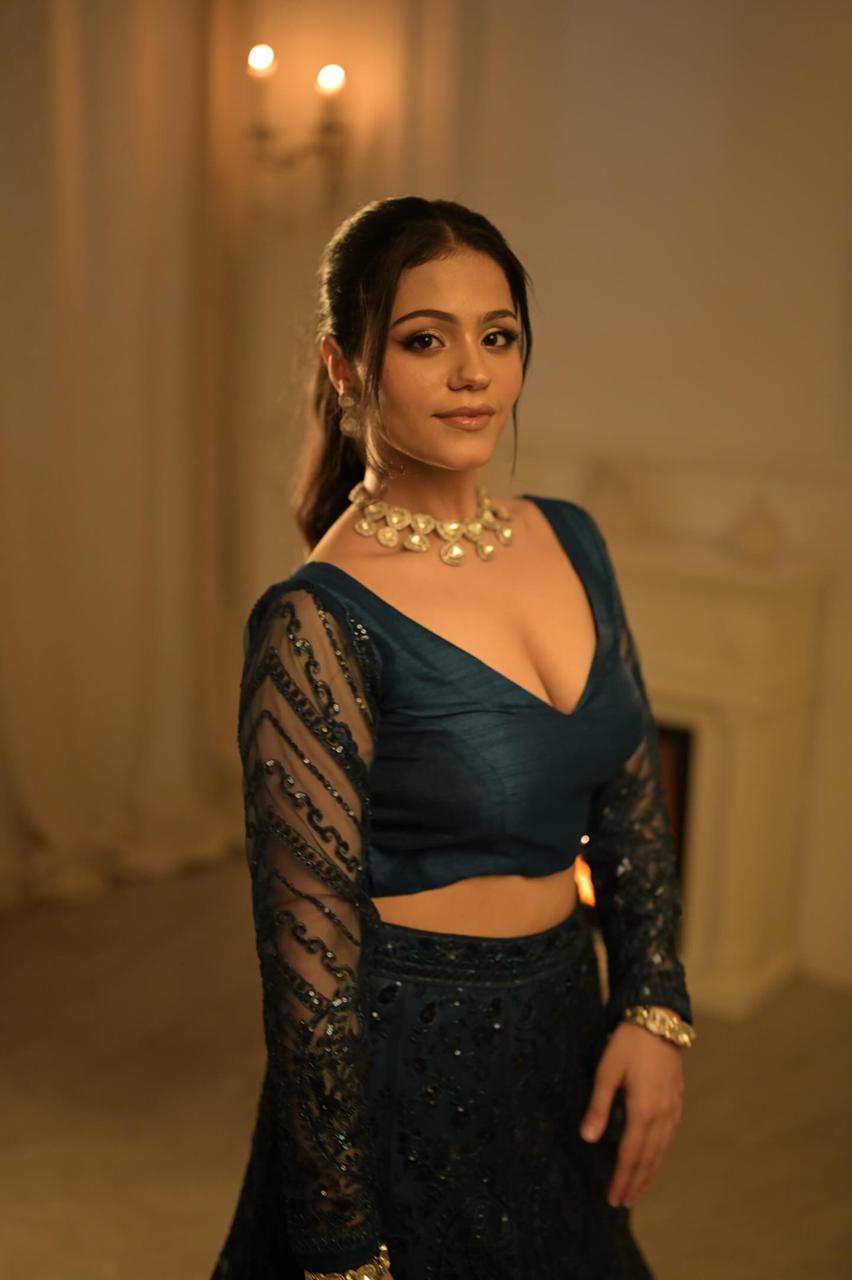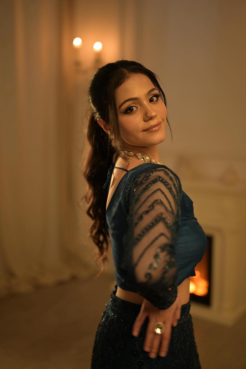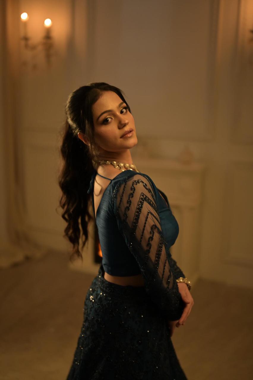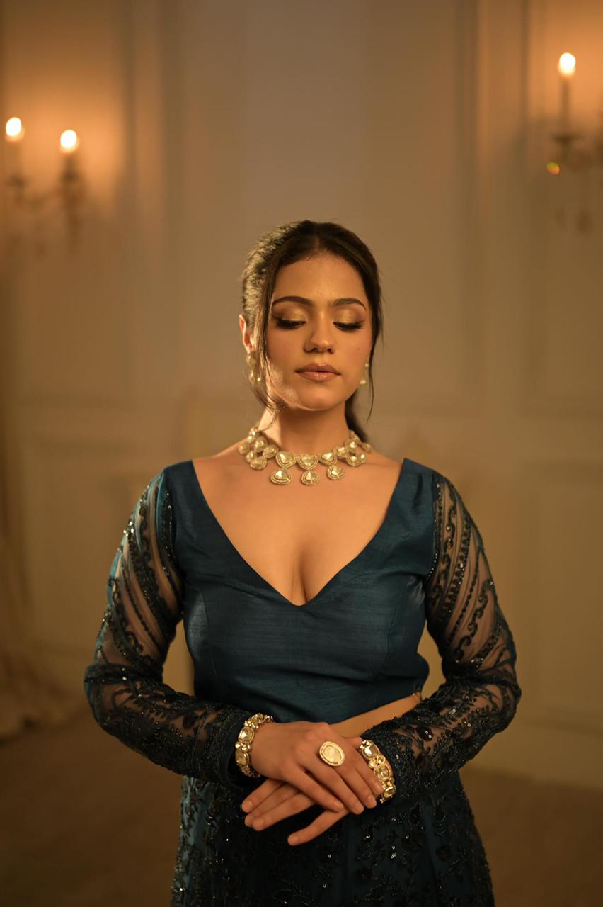 An elegant midnight teal lehenga set crafted with exquisite sequin embroidery and sheer embellished sleeves. The minimalist design of the silk blouse is perfectly balanced with intricate detailing on the skirt, making it ideal for receptions, cocktail nights, and festive celebrations. A statement of sophistication and timeless allure.