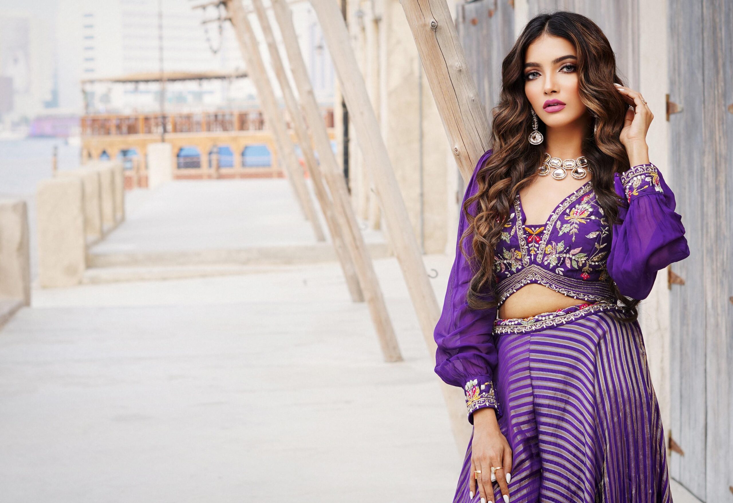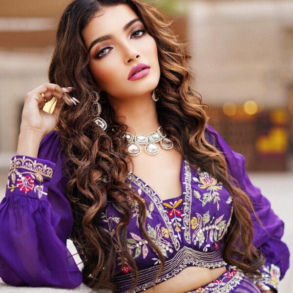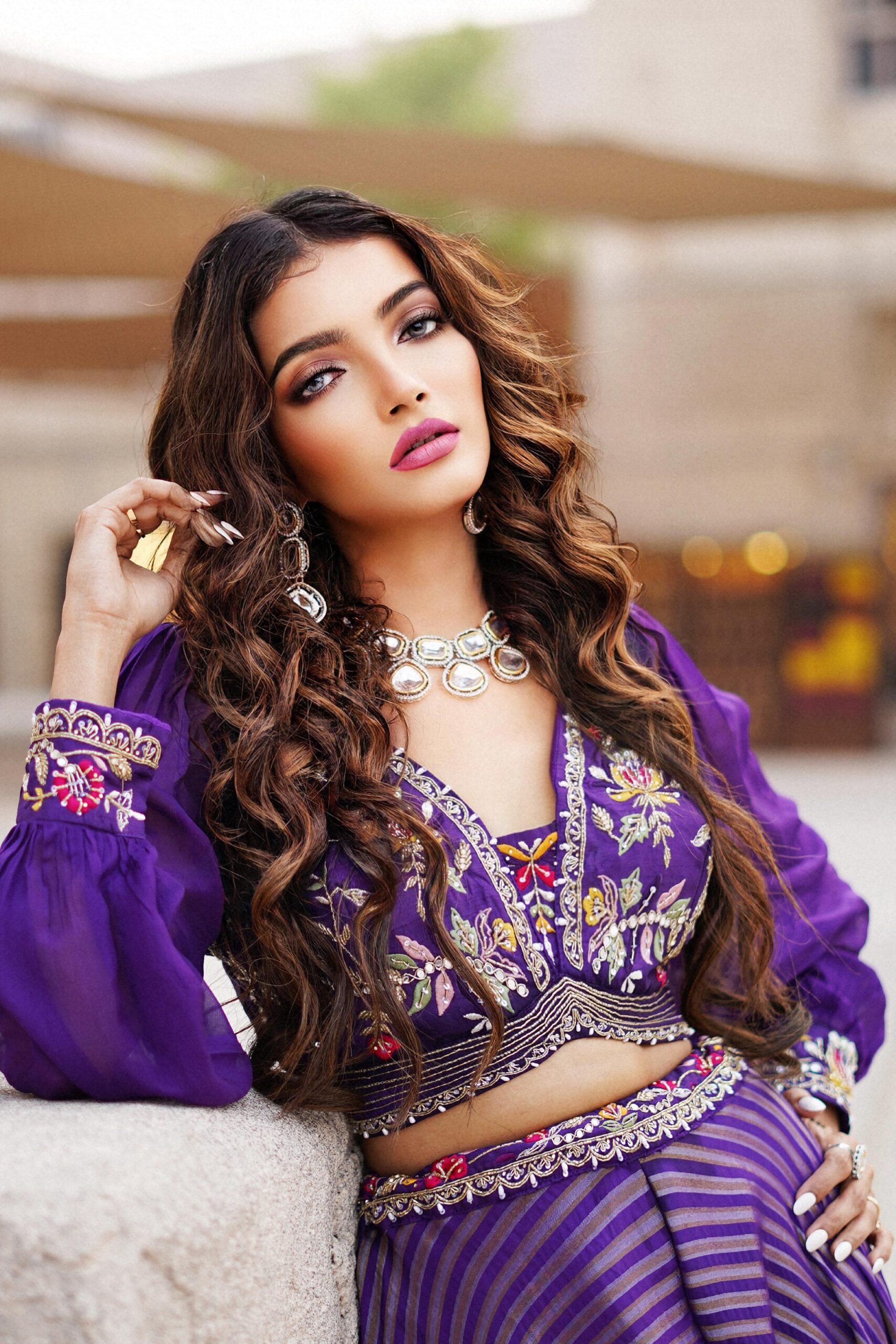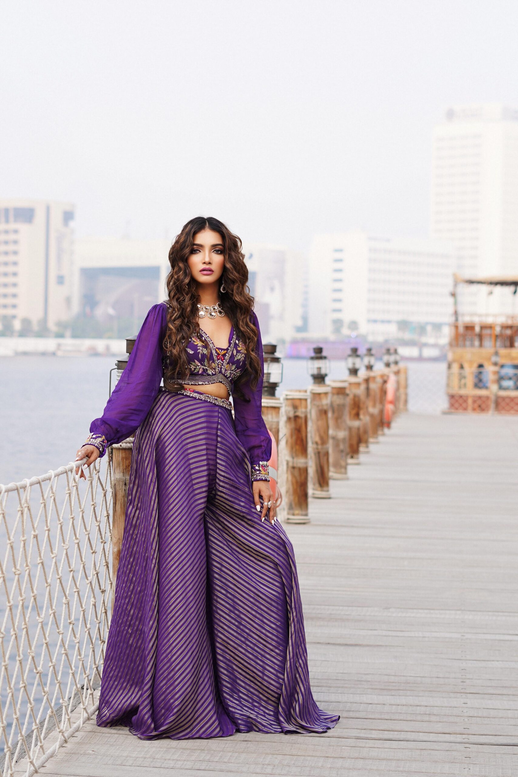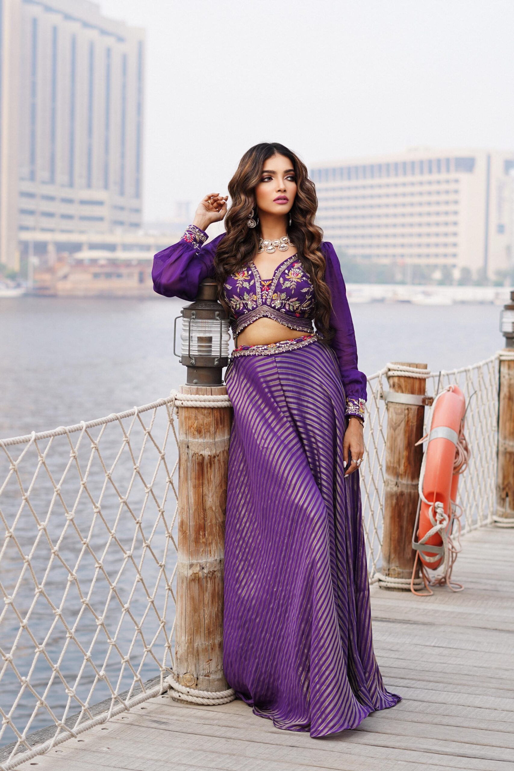 A striking violet lehenga set featuring intricate multicolor floral embroidery on a sheer organza base. The blouse showcases delicate thread and mirror detailing with statement puff sleeves, while the striped skirt adds a touch of contemporary flair. Perfect for festive occasions, mehndi nights, or luxury evening events.